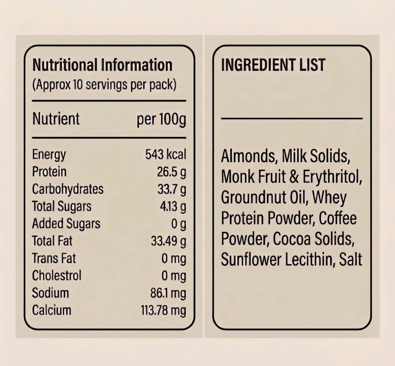 Ingredient list - Almonds, Milk Solids, Monk Fruit & Erythritol, Groundnut Oil, Whey Protein Powder, Coffee Powder, Cocoa Solids, Sunflower Lecithin, Salt